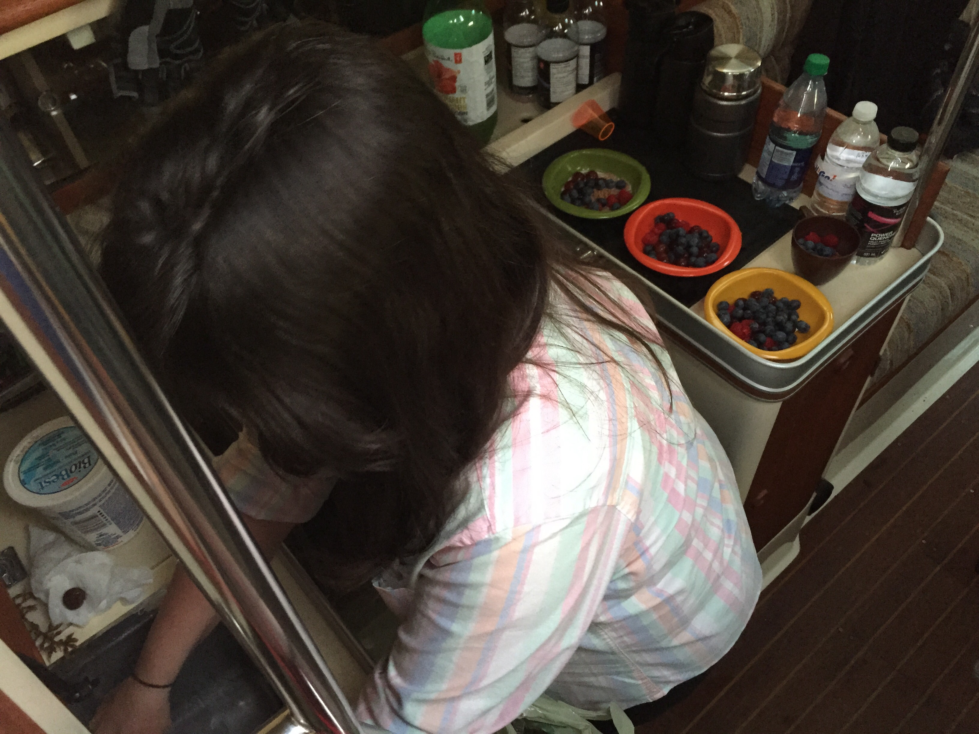 We also made lunch every morning so as to minimize going below throughout the day. No need to risk anyone joining the chum club when the boat was arockin’! This was almost always a wrap of some sort – meat and cheese and some veggies for crunch – spread first with hummus for added protein, and because anyone who knows the first mate, knows she don’t do mayonnaise right? The Cap’n, after 21 days, was overheard saying, in true NL style, “if I never sees anudder friggin’ wrap again, I won’t be sad”.