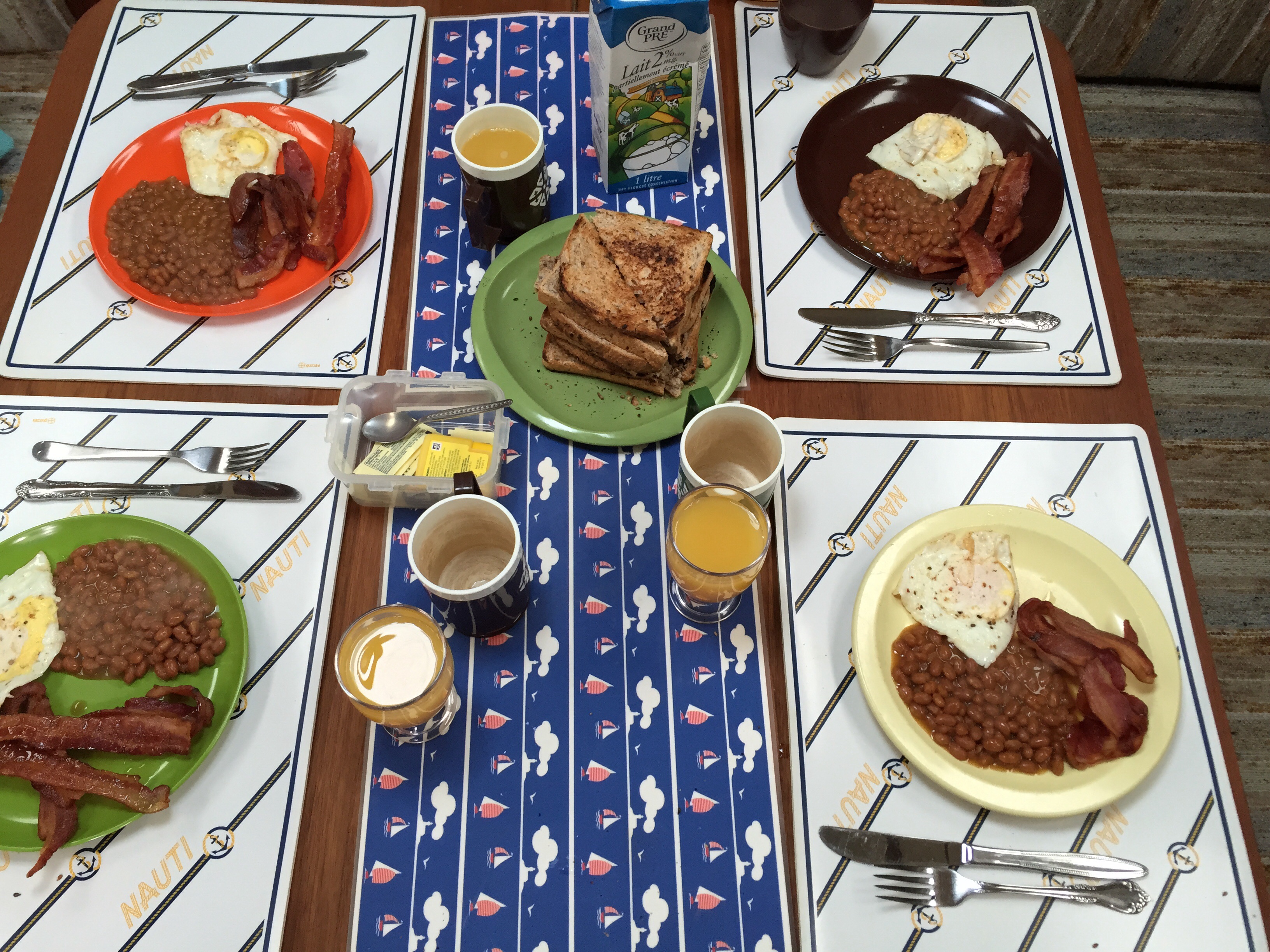 Our daily routine consisted of an alternating breakfast of either bran, berries and yogurt (the healthy and quick choice) or bacon, eggs, fish cakes, beans, toast (the not so healthy and not so quick choice). But there are shortcuts to everything – Kirkland’s precooked bacon, Janes’ frozen fish cakes, Bushs’ canned beans…….. No need to start from scratch.