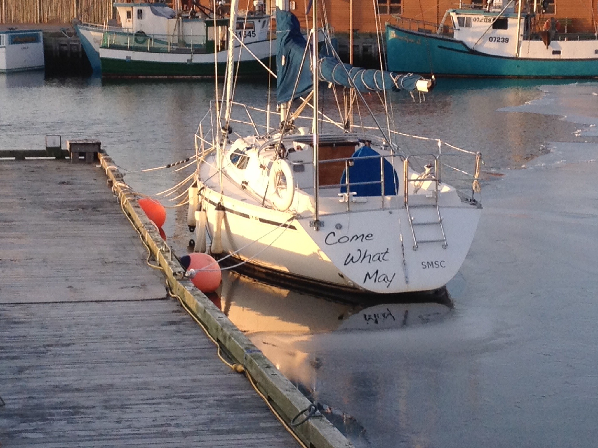 So the ice is starting to form in the harbour at Hr. Grace. Come What May is doing just fine in her winter home.